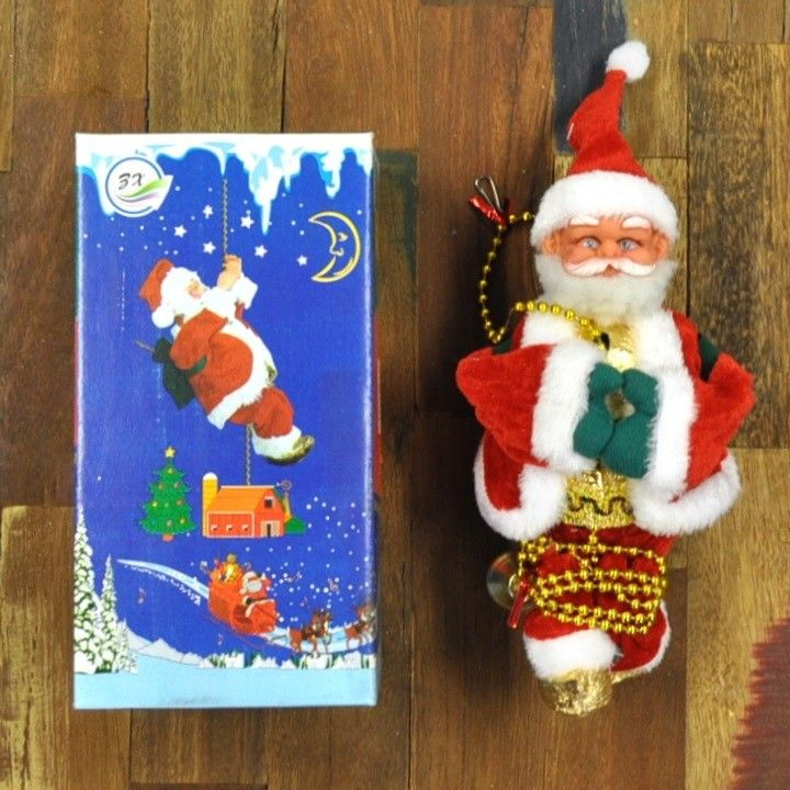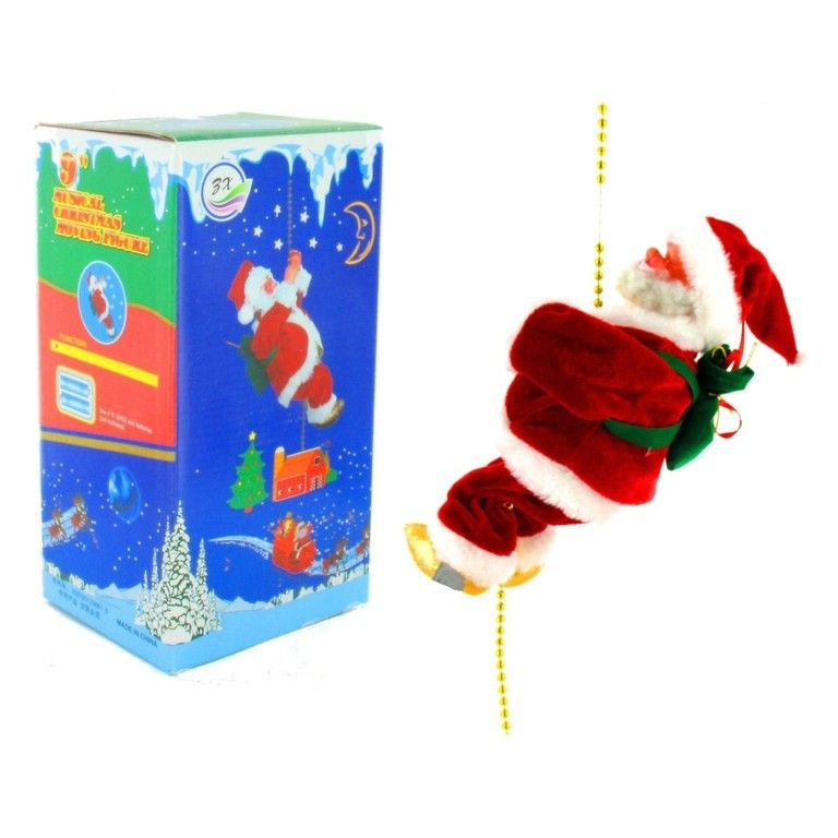 This Santa climbs into the supplied cord upwards .... and then down again .. Several cute Christmas tunes .. in Santa shines a light and the poor also move yet !! Very nice box, the Kertman is 24 cm and the cord is 115 Cm. long.