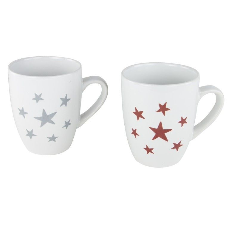 A beautiful box containing six large Christmas mugs. The mugs are all stars and comes in gray and red colors.