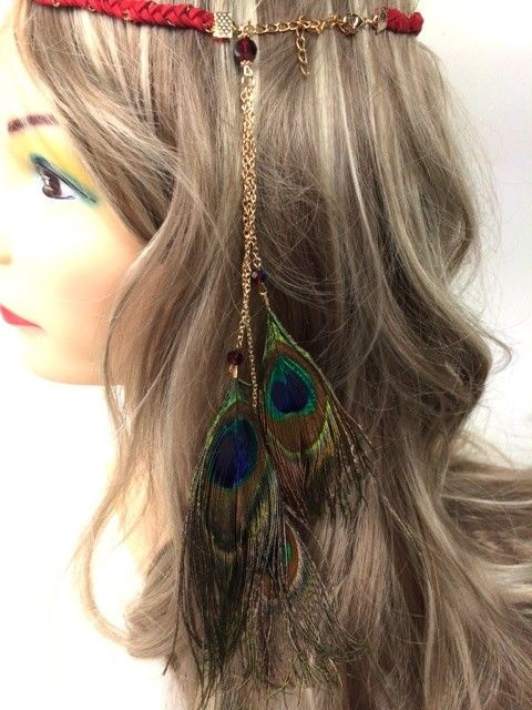 S_600029E - IBIZA LOOK BRAIDED HAIR BAND WITH PEACOCK FEATHERS BORDEAUX (1st)