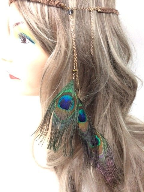 S_600029A - IBIZA LOOK BRAID BROWN HAIR BAND WITH PEACOCK FEATHERS (1st)