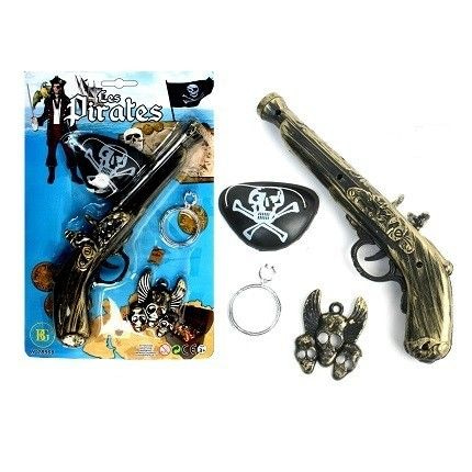 Fun pirate set, on a 30 x 11 Cm card. In this pirate set are the following articles: Pirate pistol, eye patch, earring and a pirate emblem