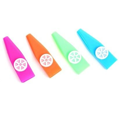 Music Kazoo, blow it and you hear a sound. Comes in mix colors.