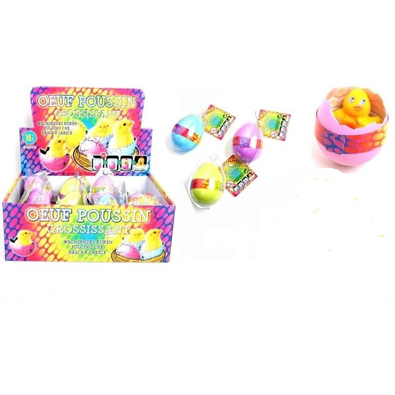 Growing Chicks in an egg. Put the egg in the water and wait 72 hours then the chick comes out of the egg and starts to grow. Packed in a nice display box.