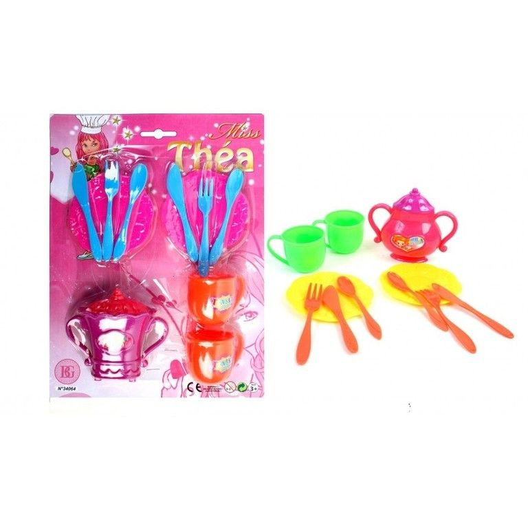 Nice Tea set on card, consisting of: 1x Tea pot, 2x Cups, 2x Dishes and cutlery. To make your own tea wreath or picnic. is delivered in mix colors.