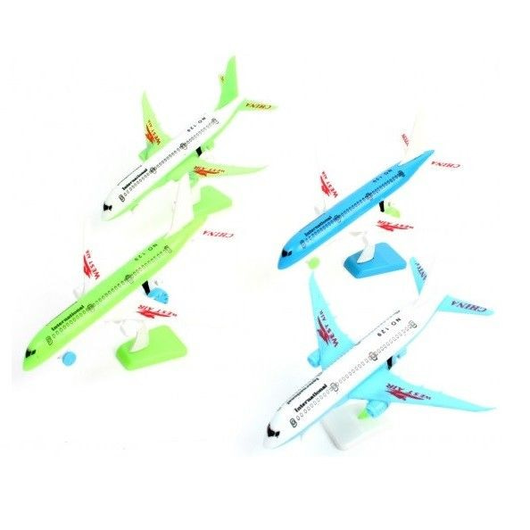 Nice pull back plane, pull it backwards and release it .. then he drives forward automatically. Also comes with a stand to put this aircraft on a stand. is delivered in mix colors.