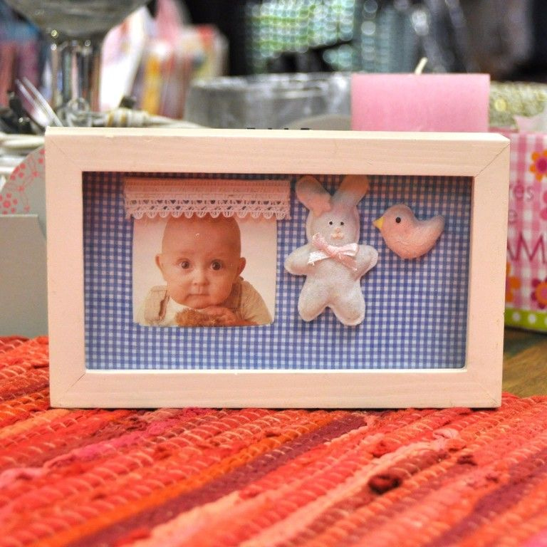 A deep picture frame with meubulair it, just like looking into a children's room with a picture on the wall. The original image can be replaced by an own picture. The picture frame can be put down or suspended.