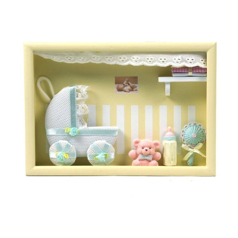 A deep picture frame with meubulair it, just like looking in a nursery. Beautiful and cute decoration for the nursery. The wall decorations can be put down or hung.