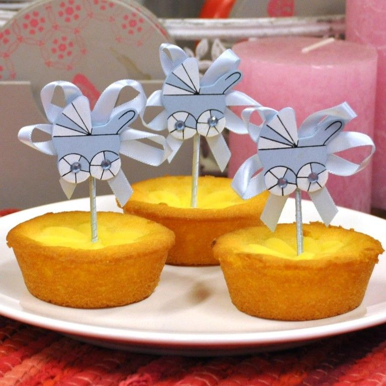 A cupcake pricker in the form of a stroller. The cupcake stick also has cute frills on the side.