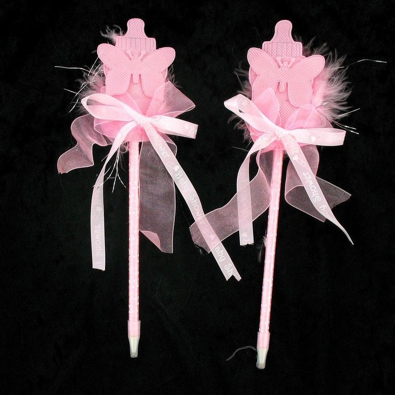 A pink pin with a drink bottle on the top and frills. A nice little something during a baby shower or thank you gift for guests.