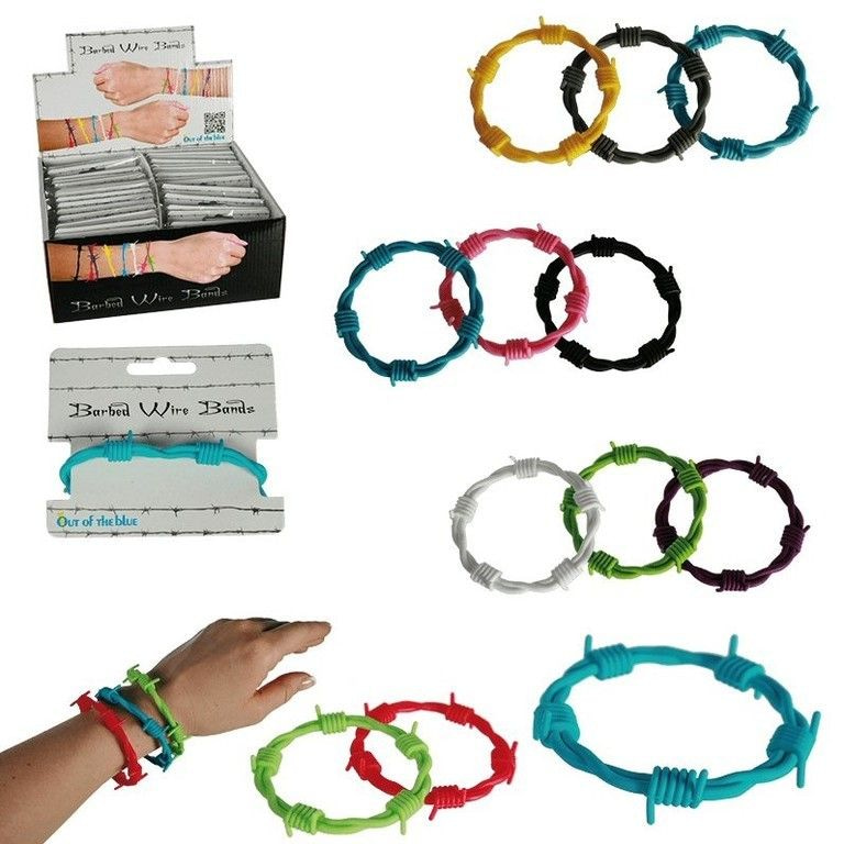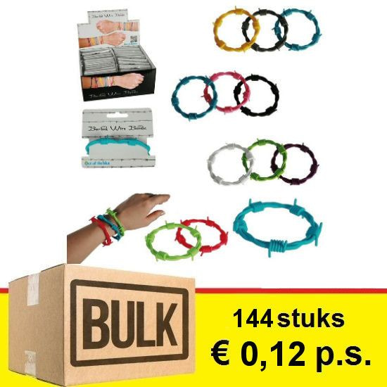 Sturdy silicone bracelets braided in barbed wire shape. The bracelets are delivered in different colors and are packed together in a display.