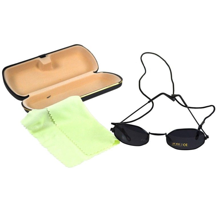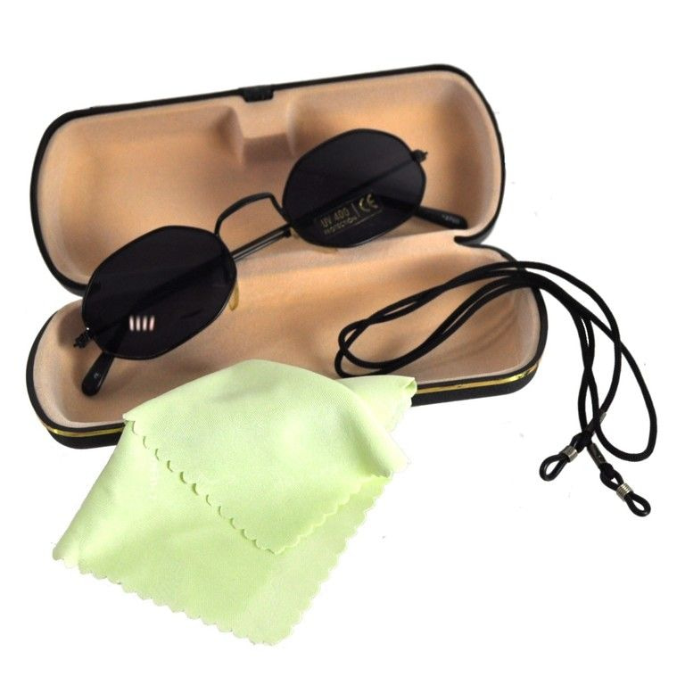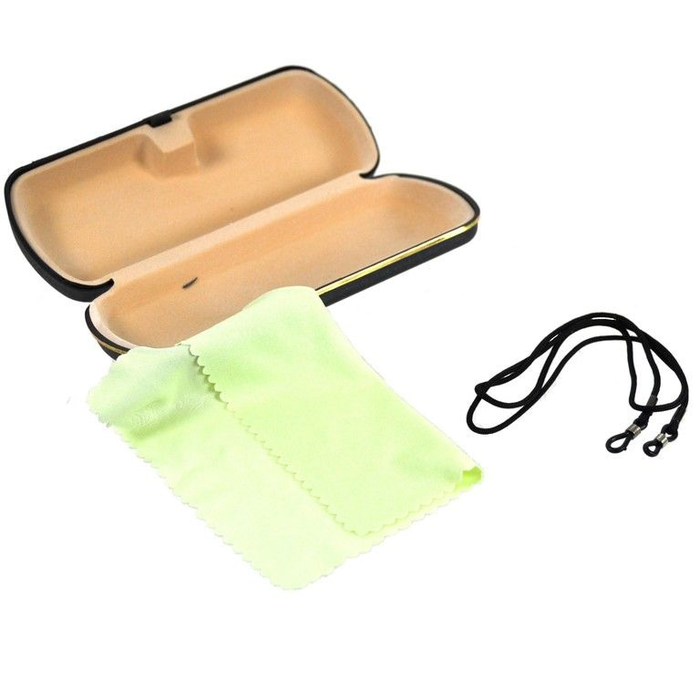 A nice inexpensive set consisting of a sturdy hard case, cleaning cloth and a neck cord for your glasses. Nice complete set for little money.
