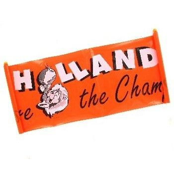 Beautiful orange banner with the words "We are the Champions" Nice article to encourage in the world football championship. Our Dutch team to The banner has two sticks to overhead waving the banner with two hands.