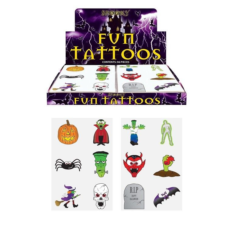 Tough Fun Tatoos, model Halloween. Each sheet consists of 6 mix types of Halloween Tattoo stickers. Packaged in a beautiful display.