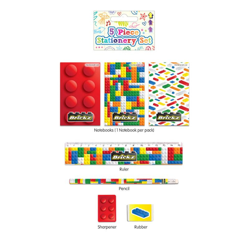 5-Piece Bricks Building Blocks Writing Set, consisting of: 1x Notebook, 1x Ruler, 1x Pencil, 1x Eraser and 1x Pencil Sharpener.