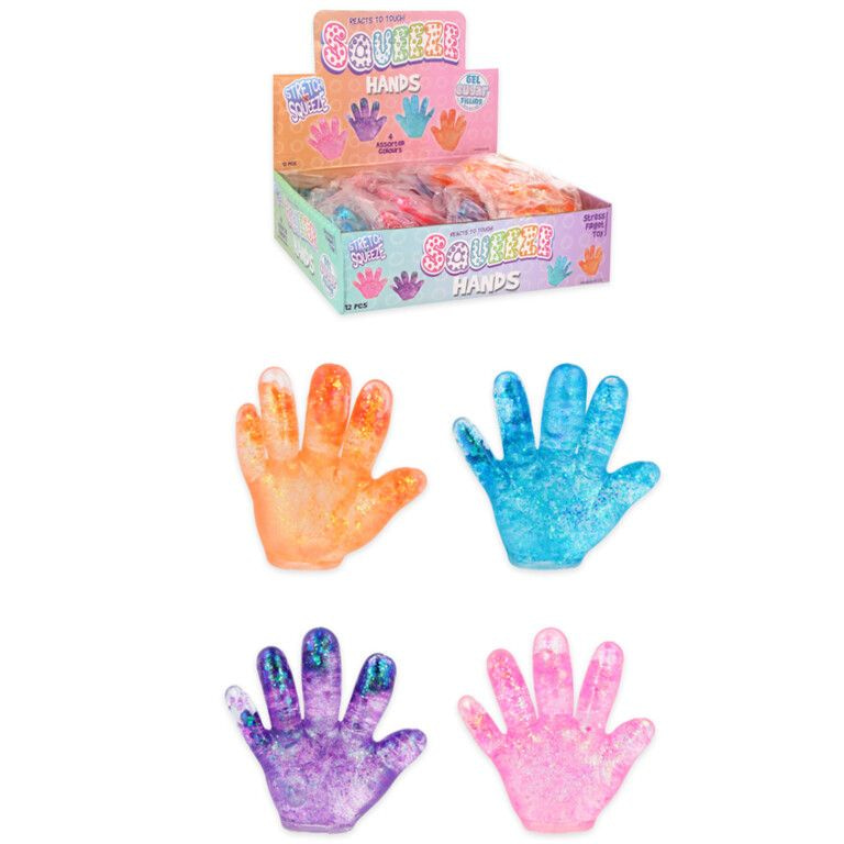 Supplied in a counter display box containing 12 units, these Squeeze Hands come in an assortment of vibrant mixed colors. They are high-turnover impulse items, perfect for retail counters, party favor bags, or as fun novelty gifts. Expand your sensory toy inventory with this popular item.