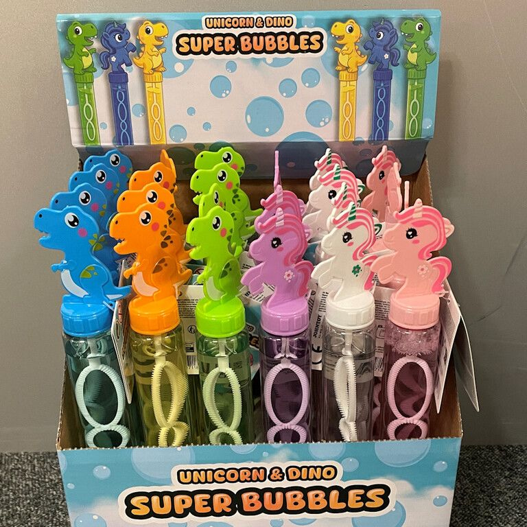 Boost your summer sales with these attractive Unicorn & Dinosaur Bubble Wands. Bubble toys remain a timeless bestseller, and these large wands (120ml) offer great value for money. The product comes in a vibrant counter display containing 24 pieces, featuring a mix of magical unicorns and cool dinosaur designs.