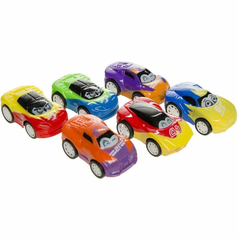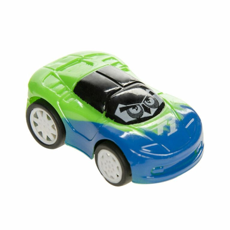 Vrolijke Frictie Sport Auto, voorzien van ogen. Trek hem naar achteren en laat hem los... vervolgens rijdt deze auto vanzelf naar voren toe. Afzonderlijk verpakt. Wordt in Mix kleuren geleverd.