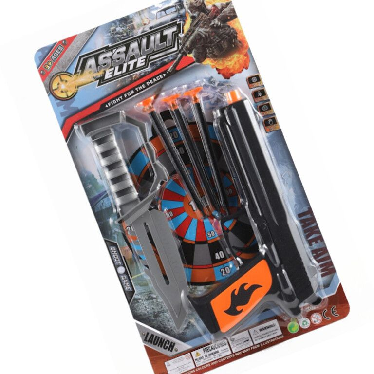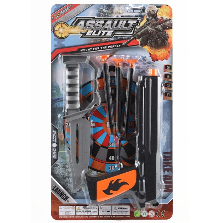 Bring action and adventure to your toy assortment with the Assault Elite Toy Set. This exciting set includes a cool toy gun, safe suction cup darts, and a rugged toy knife, all presented on a large, eye-catching blister card (21 x 37 cm).
