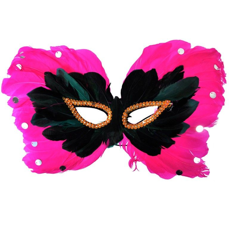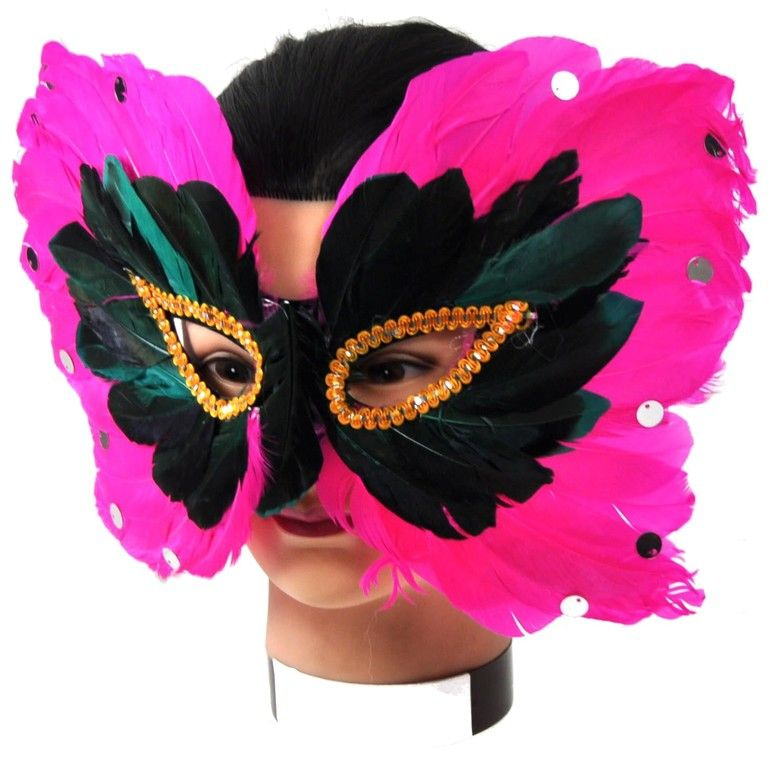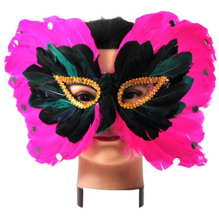 A gorgeous party mask for events, carnival and costume parties. This mask is flexible and is delicious with the face with it. At the front of the mask are graceful pink and green feathers.