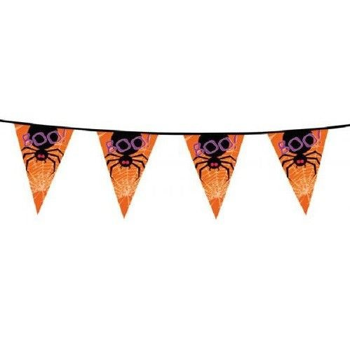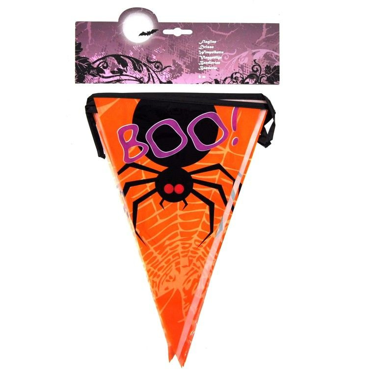 A flag line 6 meters long with triangular flags. The flags is a black spider and the text "Boo."