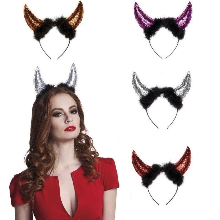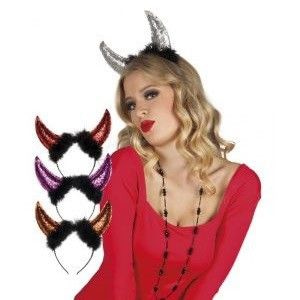 A beautiful diadem showing two devils horns filled with glitter. The crowns come in different colors and are ideal for theme parties, carnival and Halloween.