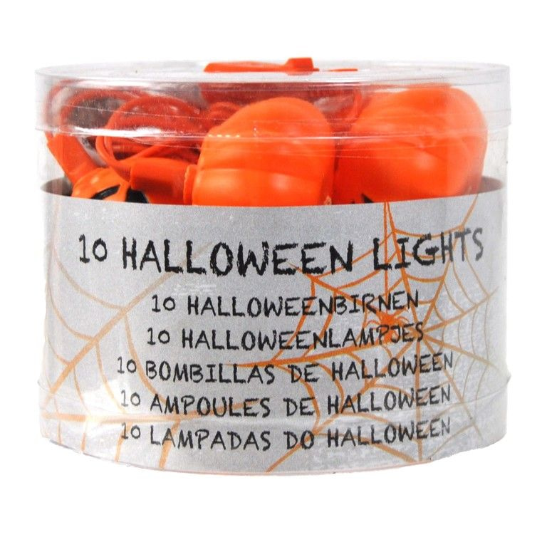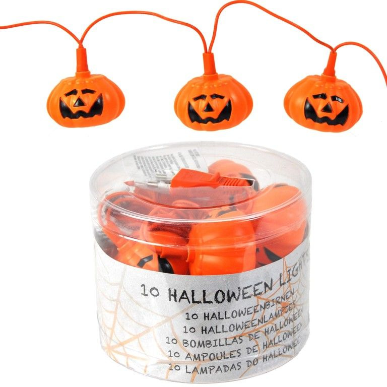 Decoration lighting for theme parties, carnival and Halloween. This lighting is about 2.85 meters long and has 10 lights in the shape of a pumpkin.