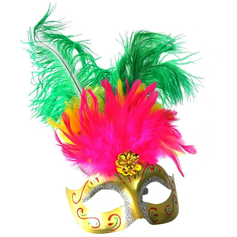 A gorgeous party mask for events, carnival and costume parties. This mask is equipped with glitters on the front and colorful feathers on top.