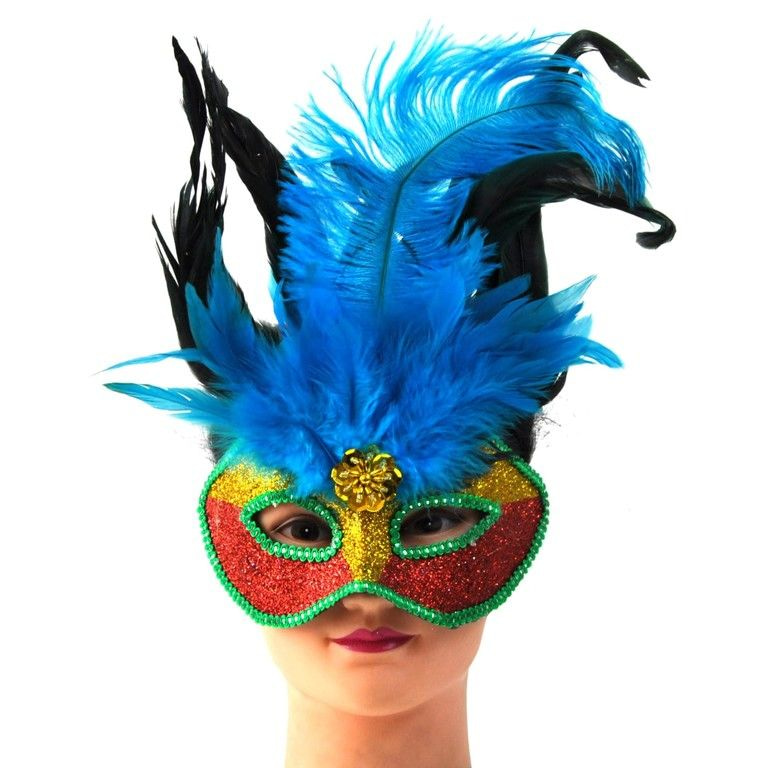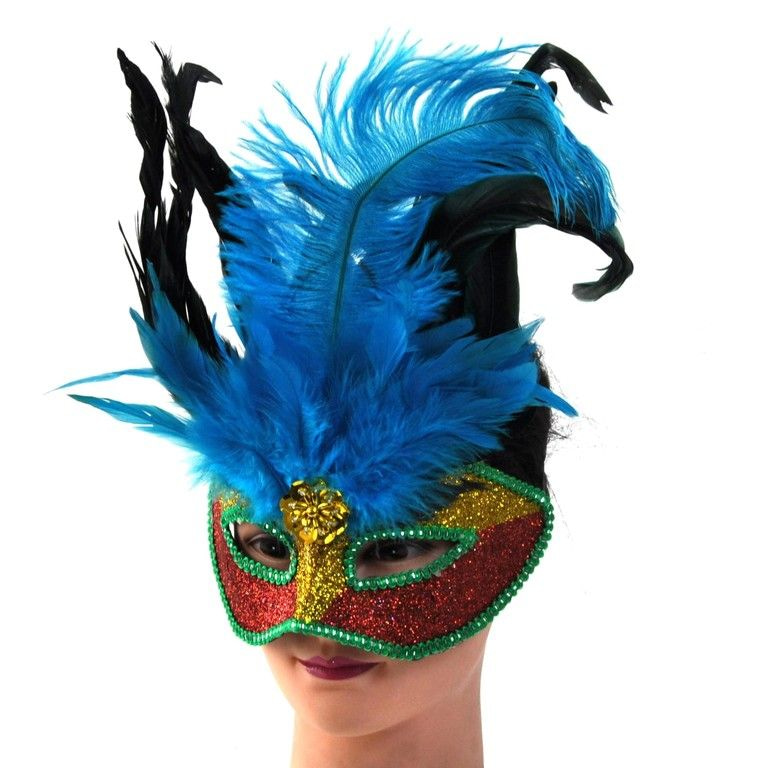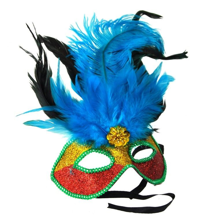 A gorgeous party mask for events, carnival and costume parties. This mask is equipped with glitters on the front and colorful feathers on top.
