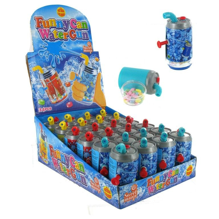 Small water gun in the form of a drink can. At the bottom is a box with delicious sweets. Tasteful combination for children in summer.