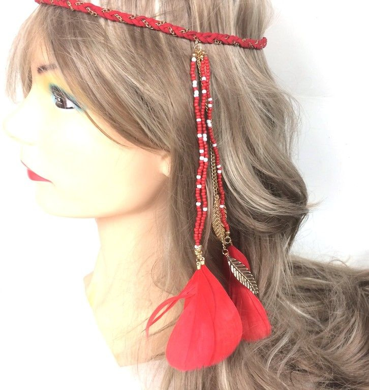 S_600113C - IBIZA LOOK BRAIDED HAIR BAND WITH FEATHERS AND BEADS RED (1st)