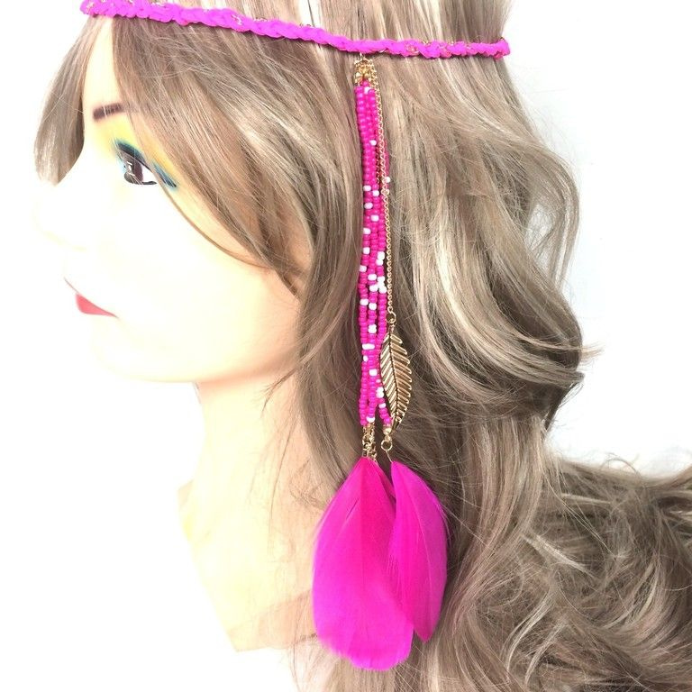 S_600113D - IBIZA LOOK BRAIDED HAIR BAND WITH FEATHERS AND BEADS FUSCHIA (1st)