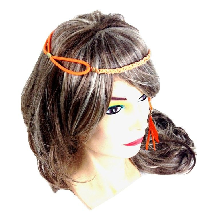 S_600113J - BRAIDED HAIR BAND WITH FEATHERS AND BEADS ORANGE (1st)