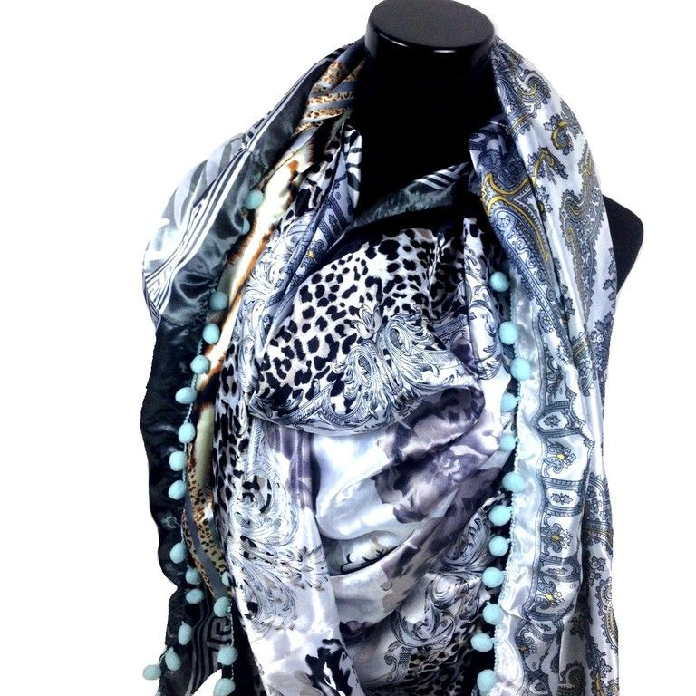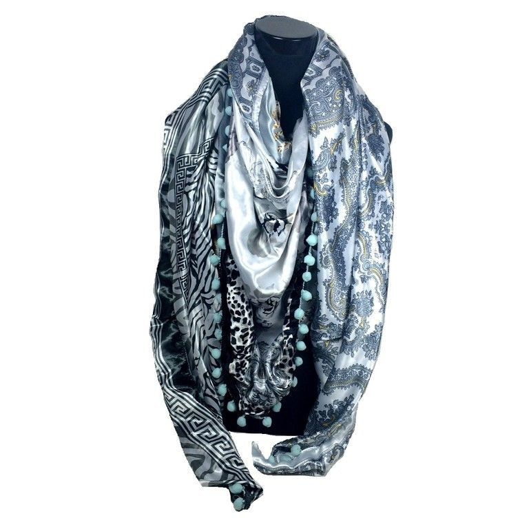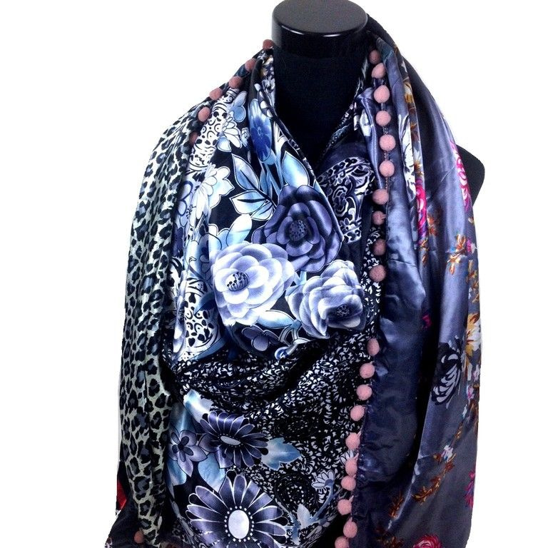 S_2149007GP - DELUXE 2-SIDED TRIANGLE SCARF GREY FLOWER / PANTHER (1st)