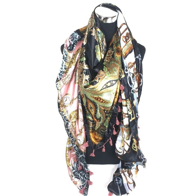 S_2149007BC - LUXURY 2-SIDED TRIANGLE SCARF BLACK / PINK tassels (1st)