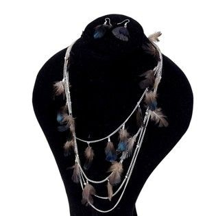 S_600762D - EXCLUSIVE EARRINGS NECKLACE WITH FEATHERS BROWN / BLUE - SILVER (1st)