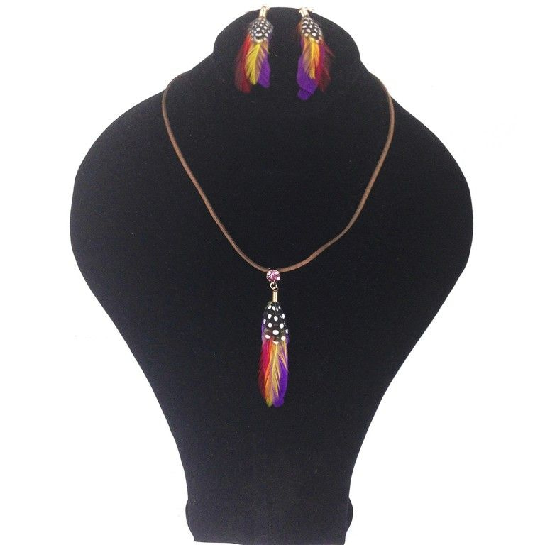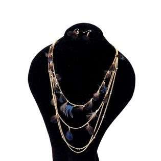 S_600762E - EXCLUSIVE EARRINGS NECKLACE WITH FEATHERS BROWN / BLUE - GOLD (1st)