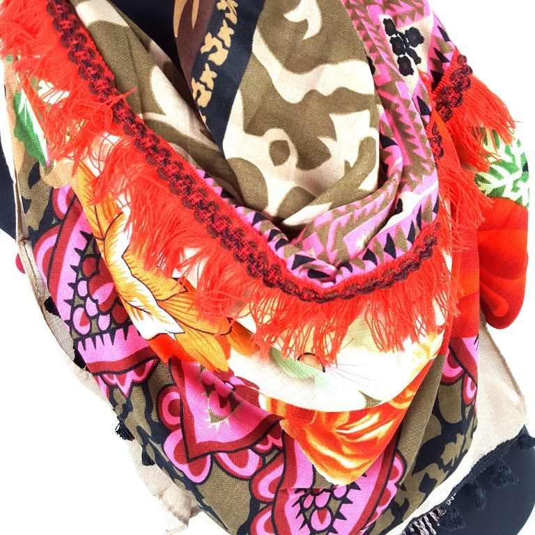 S_2539005 - TRIANGLE SCARF MULTI BRUSH ORANGE FLOWERS & TIGER (1st)