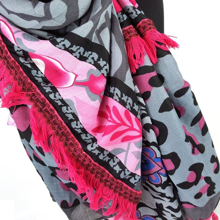 S_62153C - TRIANGLE SCARF GREY TIGER PRINT WITH FRILLS - MODEL AZTEK (1st)