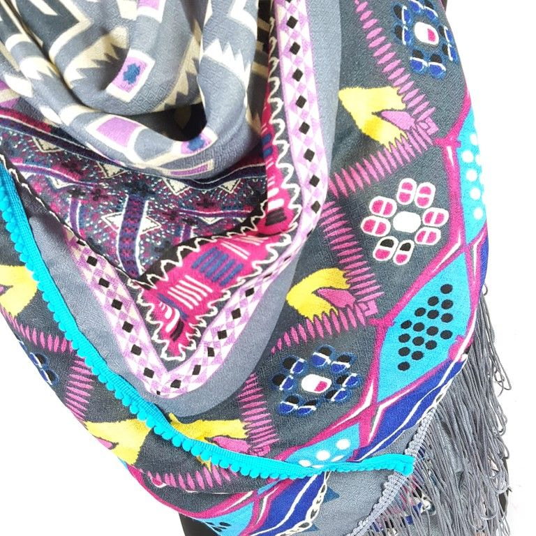 S_2546900 - TRIANGLE SCARF GREY / BLUE / PURPLE AZTEK FRILLS & BRUSH (1st)