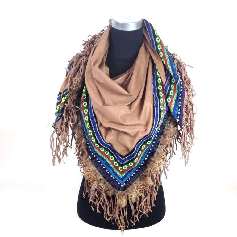 S_2331503 - LUXURY BROWN suede TRIANGLE SCARF WITH FEATHERS AND FRILLS (1st)