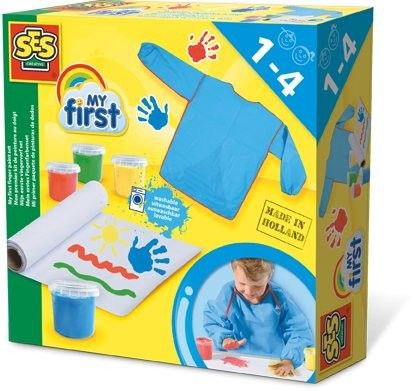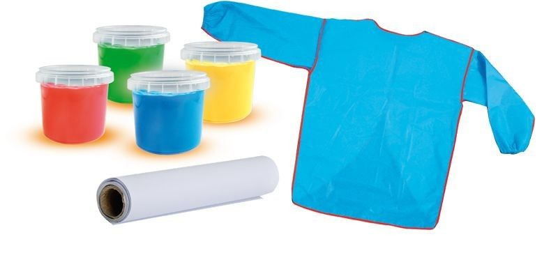 Nice clothes! This set contains everything young children need to get acquainted with finger paint. Pull out the apron, roll out the paper and the clothes can begin.