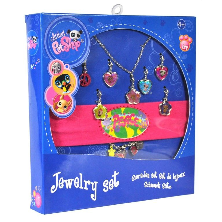 Beautiful jewelry set of the famous cartoon series "Littlest Pet Shop". In this set you will find a necklace, bracelet, headband and many charms with different Littlest Pet Shop characters on it.