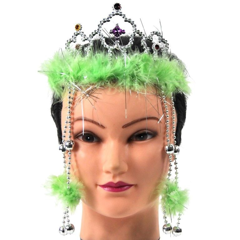 A shiny silver crowns for princesses and queens. This crown is fitted with a soft plush edge, and long drawstrings with plush balls running along the face.